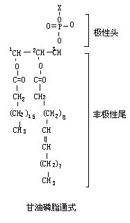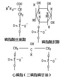 甘油的C(1)和C(2)羥基被脂肪酸酯化,C(3)羥基被磷酸酯化,磷酸又與一極性醇X—OH連接,這就構(gòu)成甘油磷脂。分子的非極性尾含有兩個脂肪酸的長烴鏈,甘油C(1)連結(jié)的常是含16或18個碳原子的飽和脂肪酸,其C(2)位則常被16~20個碳原子的不飽和脂肪酸占據(jù)。磷酰—X組成甘油磷脂的極性頭,故甘油磷脂可根據(jù)極性頭醇(X—OH)的不同分類。X=H構(gòu)成最簡單的甘油磷脂,叫做磷脂酸,它在生物膜中僅有少量。通常存在于生物膜中的甘油磷脂都有極性頭。重要的甘油磷脂極性頭基舉例如下。