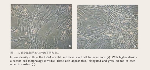 在體外培,根據細胞培養密度的不同,HCM表現出兩種不同的顯著形態特征。當細胞以較低密度培養時,HCM會長得比較肥,細胞延展性差,顯得比較短(如圖1a)。當細胞密度逐漸增加時,心肌細胞則呈現第二種形態。心肌細胞開始 細,拉長并開始在彼此上層生長而形成團塊(如圖1b)。在這些團塊之間,稍肥大的細胞平行排列。