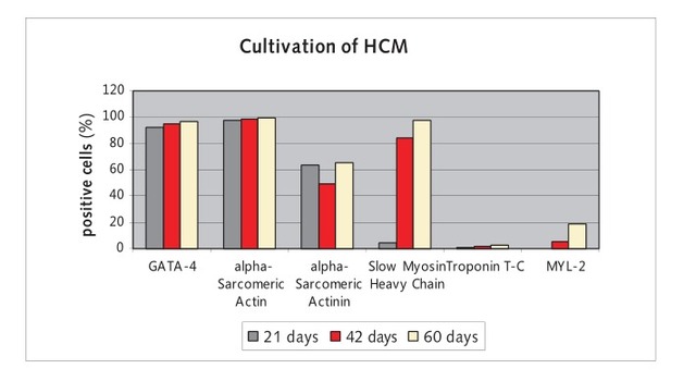 結果中的結論可以由對PromoCell培養,過程h45-間點的分化標記物的分析來證%。當觀察到肌管樣構時,就會檢測c后期分化階段的標記物。隨著培養時間的延長,呈現出后期分化狀態的HCM數量增加,并且開始有20%以上的HCM表達最終分化狀態的一些特異性標記物。在這些時間點,PromoCell的HCM開始形成分支狀結構。
