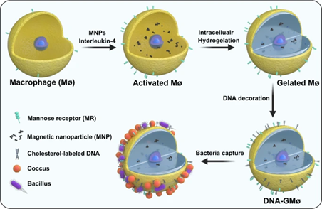 首先將M?s與超順磁性氧化鐵納米顆粒孵育,以獲得磁性細(xì)胞。同時使用細(xì)胞因子(如IL-4)誘導(dǎo)病原體結(jié)合受體的上調(diào)。然后通過直接滲透光引發(fā)劑和單體,以及隨后的紫外線照射,實現(xiàn)胞內(nèi)水凝膠化。最后,響應(yīng)特定細(xì)菌的DNA傳感元件(例如DNAzyme)可以很容易地修飾在凝膠細(xì)胞上,以便方便,快速和高靈敏度的熒光讀數(shù)。