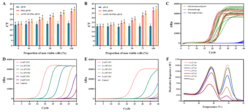 圖4所示。應(yīng)用AuNPs-SD-PMA-qPCR、PMA-qPCR和qPCR技術(shù)鑒別L. monocytogenes(A)和Salmonella (B)的活/非活細(xì)胞。(C) AuNPs-SD-PMA-qPCR檢測的特異性。(D-E)不同梯度稀釋L. monocytogenes和Salmonella的擴增曲線。(F)不同梯度稀釋的L. monocytogenes和Salmonella的熔化曲線。不同小寫字母表示不同檢測方法擴增結(jié)果(Ct值)差異有統(tǒng)計學(xué)意義(p < 0.05)。