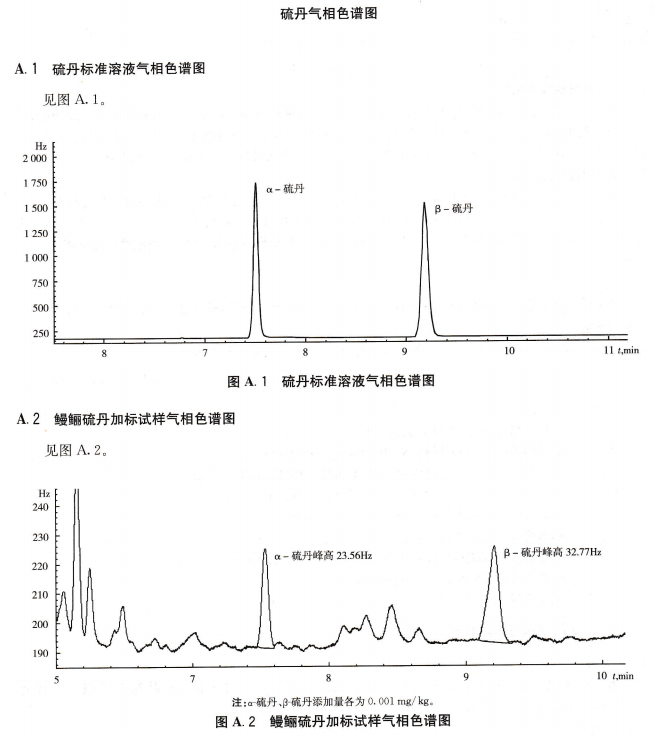 向氣相色譜儀中注入試樣溶液,記錄峰面積,α-硫丹的響應值應在標準曲線的線性范圍 0. 001 μg/mL?0. 2 μg/mL之內,β-硫丹的響應值應在標準曲線的線性范圍0. 001μg/ mL?0. 2μg/ mL 之內,根據色譜峰的保留時間定性,用外標法定量。鰻鱺加標試樣、鰻鱺試樣的氣相色譜圖參見附錄A中的圖A. 2和圖A. 3。