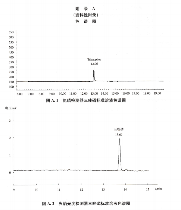 本標準所用試劑在三唑磷出峰處應無干擾峰。除另有說明外,所用試劑均為分析純;試驗用水應符合 GB/T 6682 一級水的要求。