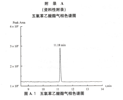 樣品提取液進樣,記錄峰面積,從標準曲線方程計算樣品待測溶液中五氯苯酚濃度。樣品待測溶液中五氯苯酚濃度應在標準曲線濃度范圍內。五氯苯乙酸酯的氣相色譜圖參見附錄A。