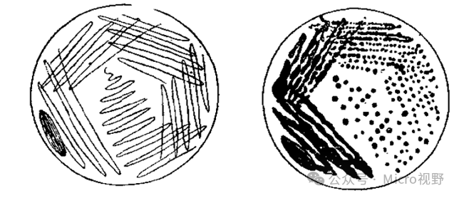 圖1 平板分段劃線(左)及培養后菌落分布示意圖