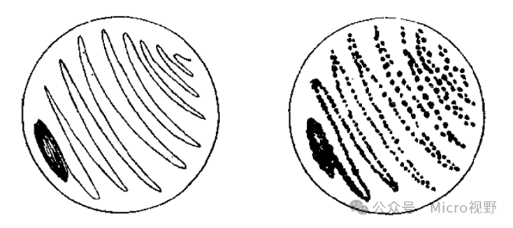 圖2 平板連續劃線法(左)及培養后菌落分布示意圖
