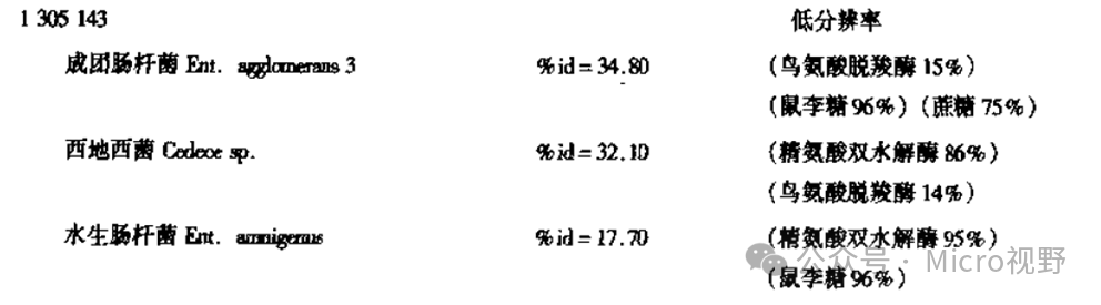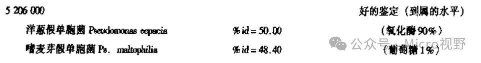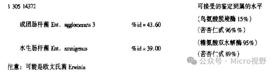 3.8.2.4 如果第一個菌名的鑒定概率<80%,就將前面兩個菌加在一起,還不足80,就將第三個也加在一起,若其和超過80,如果這幾個菌都是同一個“種”內的不同生物型,則可稱為鑒定到種級水平;如果這幾個菌都屬于同一個屬內,則稱為鑒定到屬級水平。